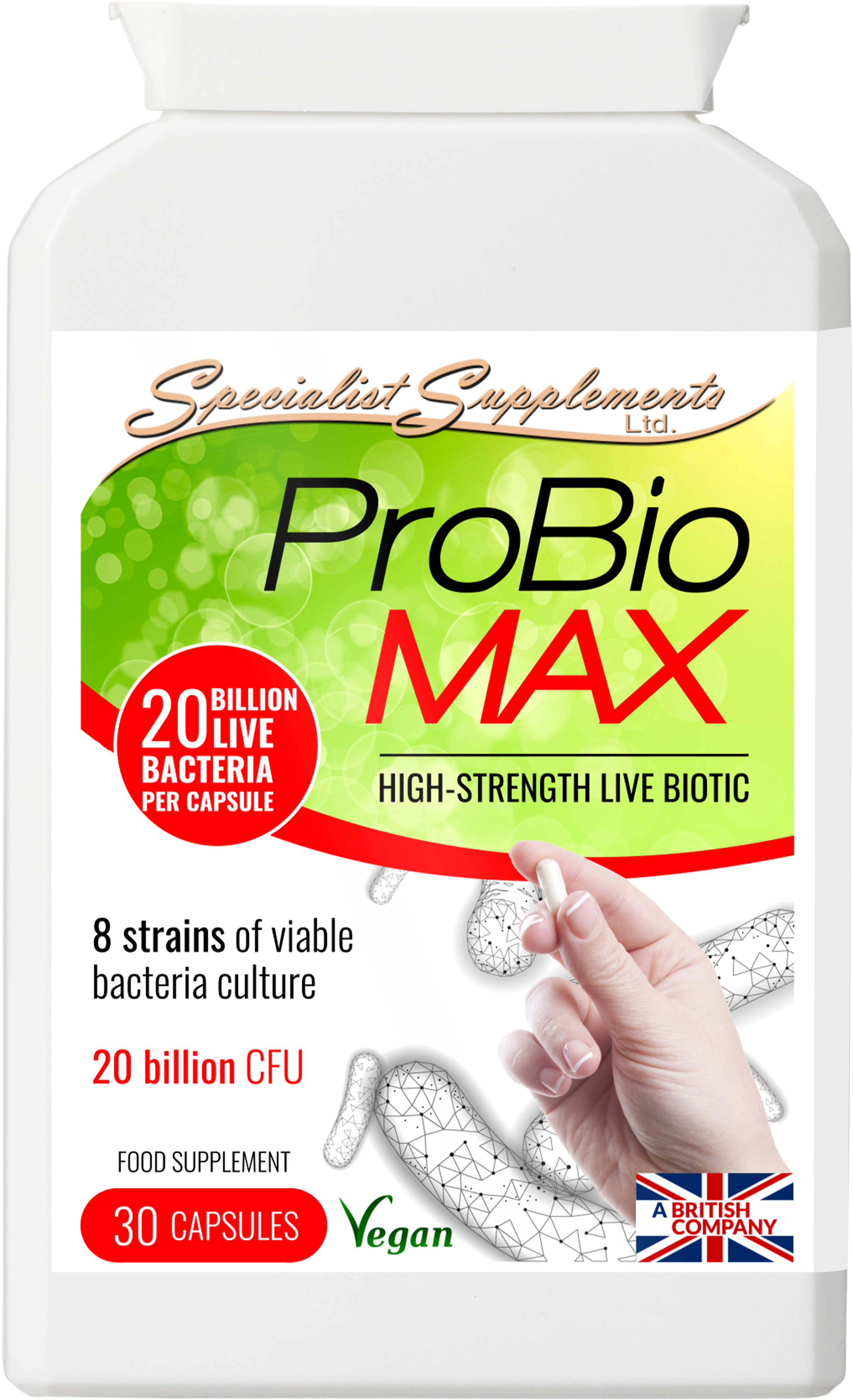 ProBio MAX is a vegan, multi-strain combination of 8 live cultures, providing 20 billion viable organisms per capsule (see below).
